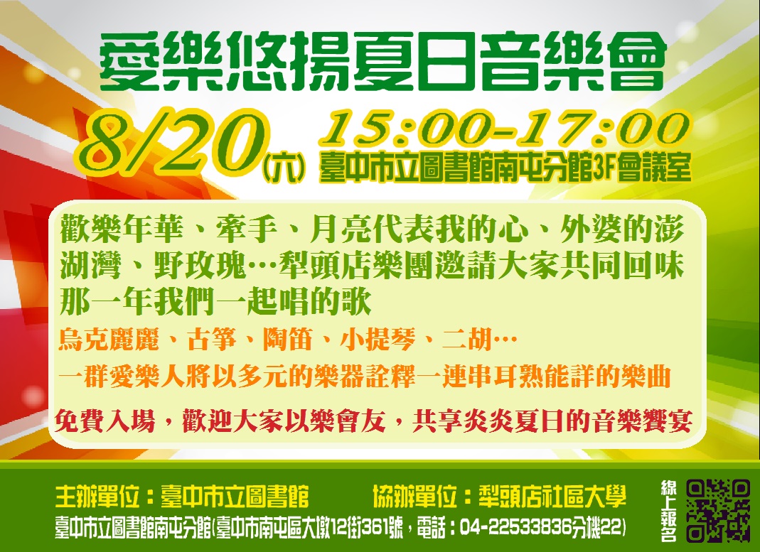 一、臺中市立圖書館南屯分館訂於8月20日(六)舉辦「愛樂悠揚夏日音樂會」活動,邀請犁頭店樂團以各種中西樂器演奏及詮釋多首經典樂曲,提升民眾藝文欣賞及走入圖書館閱讀之興趣。