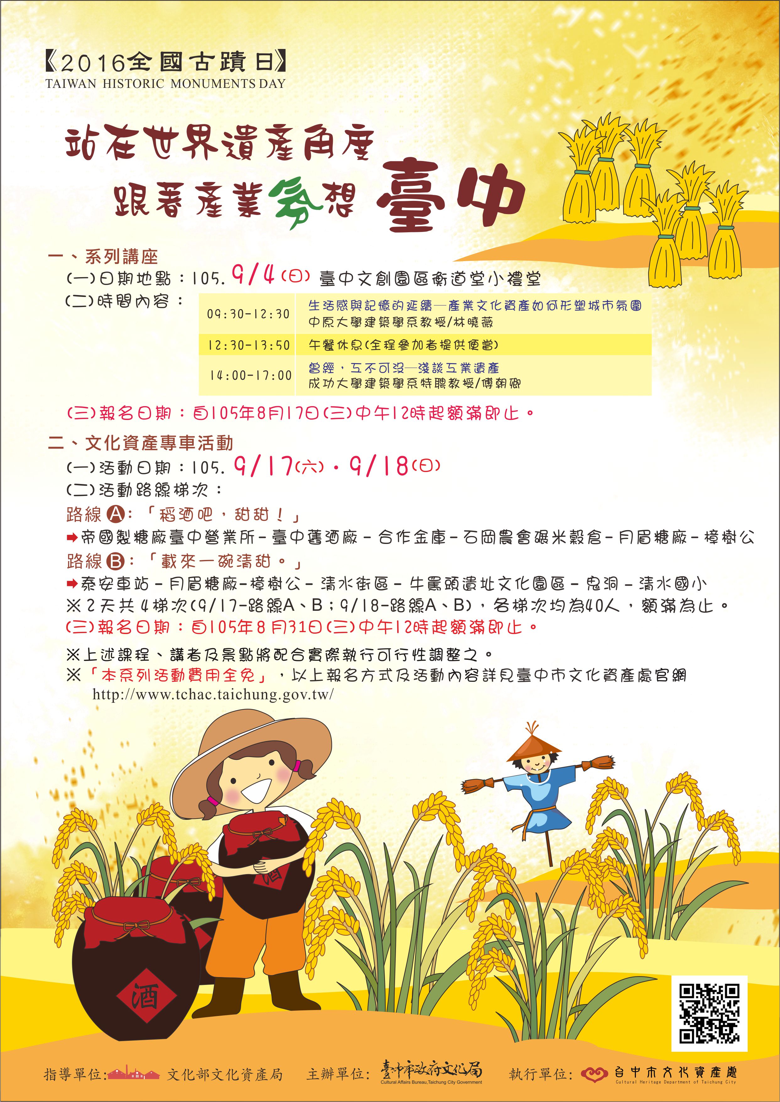 一、依據臺中市文化資產處105年8月18日中市文資遺字第1050004993號函辦理。二、本處配合文化部文化資產局「2016全國古蹟日」,訂於本(105)年9月4日、17日及18日辦理臺中市全國古蹟日活動,詳細活動內容及報名方式請上本處官網。二、另懇請貴單位惠予協助連結本處官網活動訊息(http://www.tchac.taichung.gov.tw)於貴機關網站。 聯絡人:楊小姐 聯絡電話:04-22290280~510