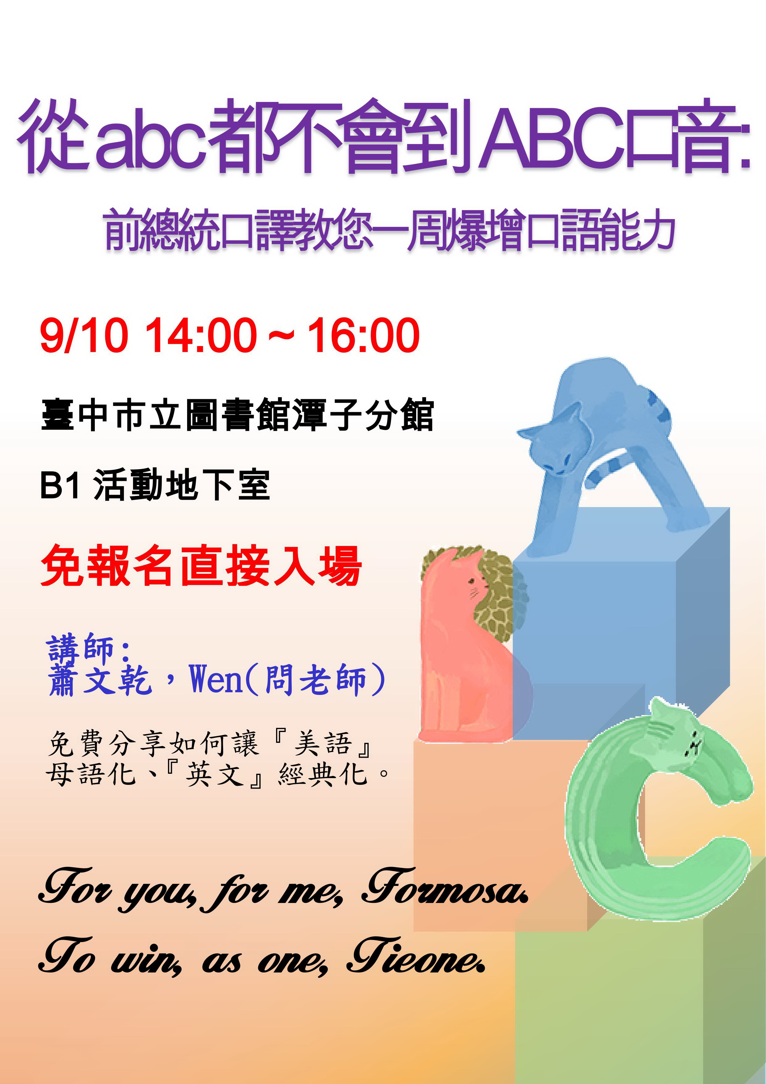 一、臺中市立圖書館訂於本(105年)9月10日(六)於潭子分館舉辦「從abc都不會到ABC口音」英語教學講座,邀請曾任總統與立法院長口譯及台灣共學雙母語協會創辦人蕭文乾老師,分享如何讓『美語』母語化、『英文』經典化。二、時間:105年9月10日下午2時至4時。三、地點:本館潭子分館B1多功能活動室(臺中市潭子區中山路二段399號)。四、報名方式:免費入場。 聯絡人:臺中市立圖書館 聯絡電話:04-25319339