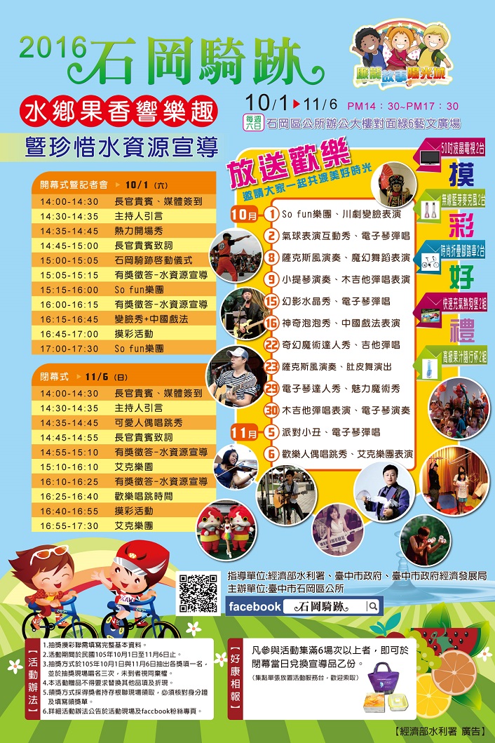 石岡區公所辦理「2016石岡騎跡-水鄉果香饗樂趣暨珍惜水資源宣導」系列活動,惠請協助宣傳週知,請查照。