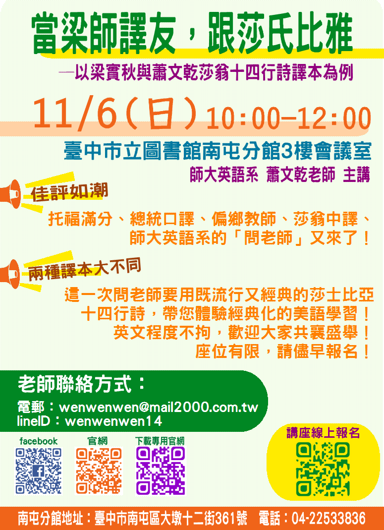 一、臺中市立圖書館南屯分館訂於本(105)年11月6日(星期日)舉辦「當梁師譯友,跟莎氏比雅-以梁實秋與蕭文乾莎翁十四行詩譯本為例」專題講座,邀請蕭文乾老師以簡單易懂的方式分享莎士比亞的原作與譯本,帶領大家體驗經典化的美語學習。蕭老師自幼居美,曾經托福滿分,並擔任過總統口譯及偏鄉教師,同時也是莎翁中譯名師,現為師大英語系老師。