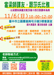 謹訂於本(105)年11月6日(星期日)於本館南屯分館舉辦「當梁師譯友,跟莎氏比雅-以梁實秋與蕭文乾莎翁十四行詩譯本為例」專題講座,敬請鼓勵所屬同仁及師生踴躍參加!