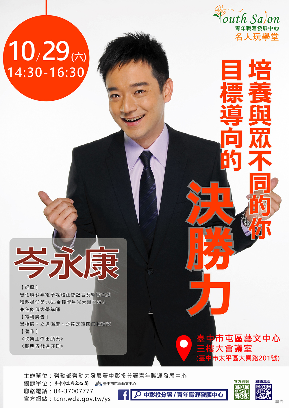 三、活動時間為105年10月29日(六)14:30-16:30;地點為屯區藝文中心3樓大會議室(臺中市太平區大興路201號),並於10月3日(一)中午12時開放於青年職涯發展中心網站線上報名http://59.120.134.70/CareerGuide/FrontShow/