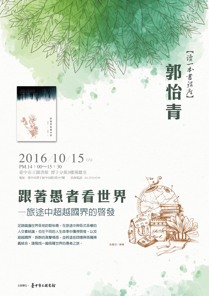 一、依據臺中市立圖書館105年10月7日中市圖輔字第1050004582號函辦理。二、旨揭講座邀請作家郭怡青分享「跟著愚者看世界-旅途中超越國界的啟發」,引領讀者環遊塔羅世界,從不同的人生故事中獲得啟發。三、時間:105年10月15日(周六)下午2時至3時30分。四、地點:本館潭子分館(臺中市潭子區中山路2段397號)。五、公教人員全程參與者核予終身學習時數2小時。六、檢附本講座文宣乙份。 聯絡人:曾先生 聯絡電話:0424225101#507