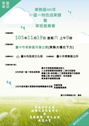 臺中市東勢區公所辦理一區一特色計劃「風華再現-東勢行旅」成果展暨草地音樂會訂於本(105)年11月19日(星期六)上午9時至下午3時,假東勢區河濱公園(東勢大橋右方公園)舉辦臺中市東勢區105年度一區一特色計畫「東勢行旅-風華再現」成果展暨草地音樂會。 聯絡人:張慕涵 聯絡電話:04-25872106#19