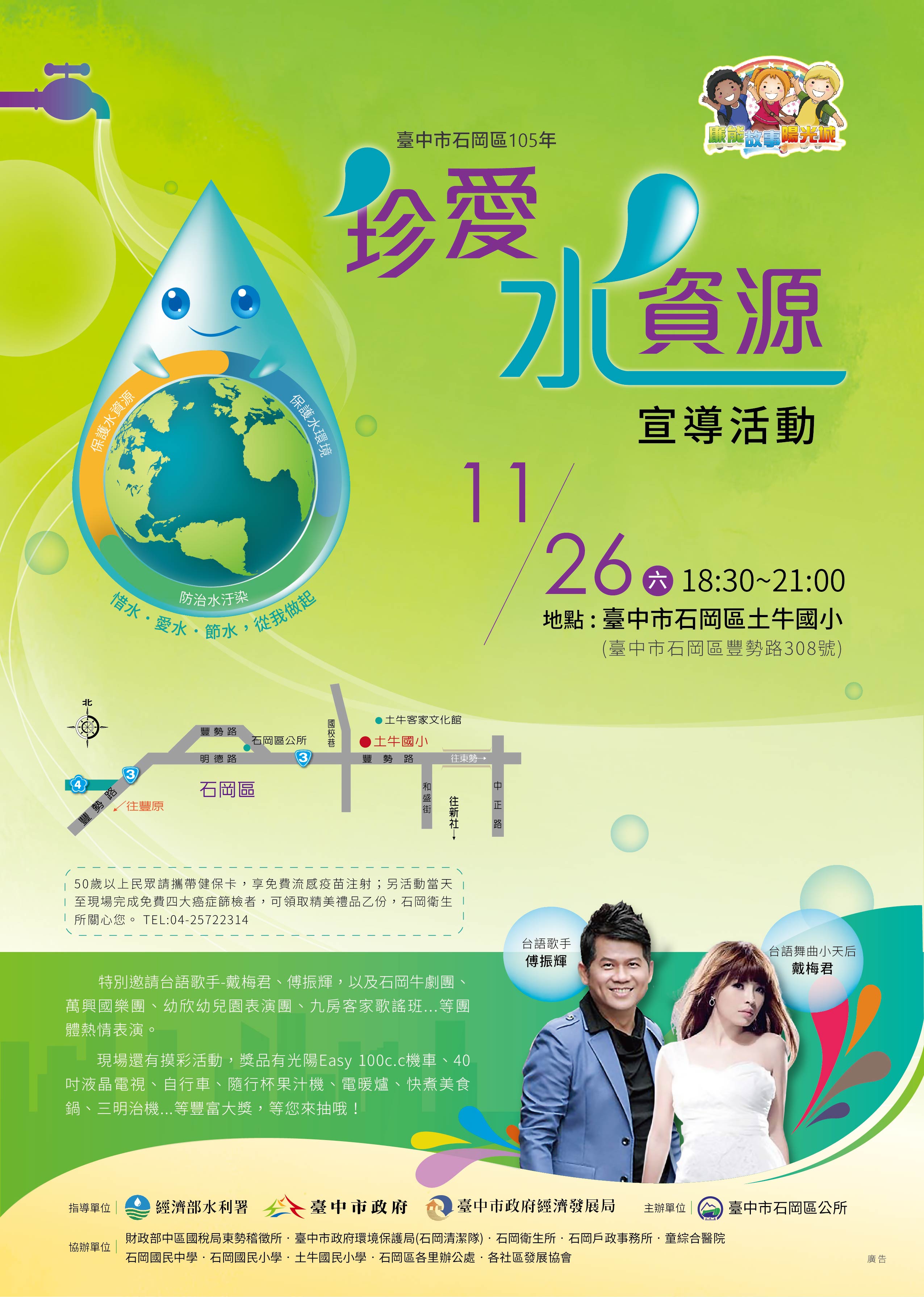「臺中市石岡區105年珍愛水資源宣導活動」將於105年11月26日(星期六)18:30假土牛國小辦理,本活動旨在推廣水資源觀念讓區民了解水資源重要,石岡區為石岡壩水源保護區,保有豐富水資源生態環境及物產,透過這次的系列活動,讓區民了解水資源重要並與水資源共生共存,藉此發展、深植、培養下一代文化藝術素養,請石岡鄉親及各界於當天一起到會場逗熱鬧。