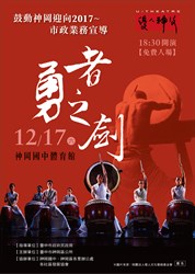 二、敬請協助於貴單位網站暨跑馬燈宣傳,本案之宣傳文案為:「千騎擁高牙,乘醉聽簫鼓~優人神鼓(王者之)—『鼓動神岡迎向2017~市政業務宣導』活動,本(105)年12月17日下午6時30分起假神岡區神岡國中大禮堂舉辦,邀請國際級演出團體『優人神鼓』演出『勇者之劍』鼓樂劇,本劇曾前往北美公演,在馬里蘭州陶松大學、印第安納波利斯巴特勒大學、加拿大渥太華國家藝術中心、多倫多萬錦市劇院…等地公演,獲得好評不斷,邀請您聆賞歲末最高水準的音樂盛宴!」