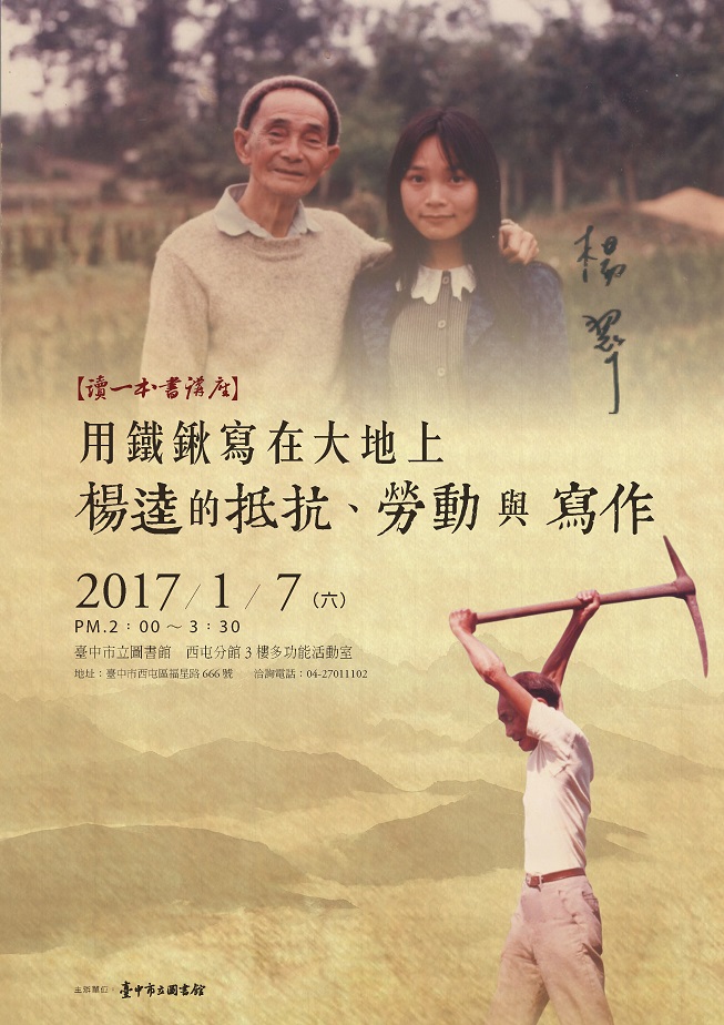 西屯分館邀請歷史學家楊翠分享「用鐵鍬寫在大地上—楊逵的抵抗、勞動與寫作」,帶領讀者從楊逵的精神、經歷與作品重見臺灣的百年史。活動時間:106年1月7日(星期六)下午2時至3時30分。活動地點:臺中市立圖書館西屯分館(臺中市西屯區福星路666號)。歡迎民眾踴躍前往參加。 聯絡人:曾敬傑 聯絡電話:04-24225101#507