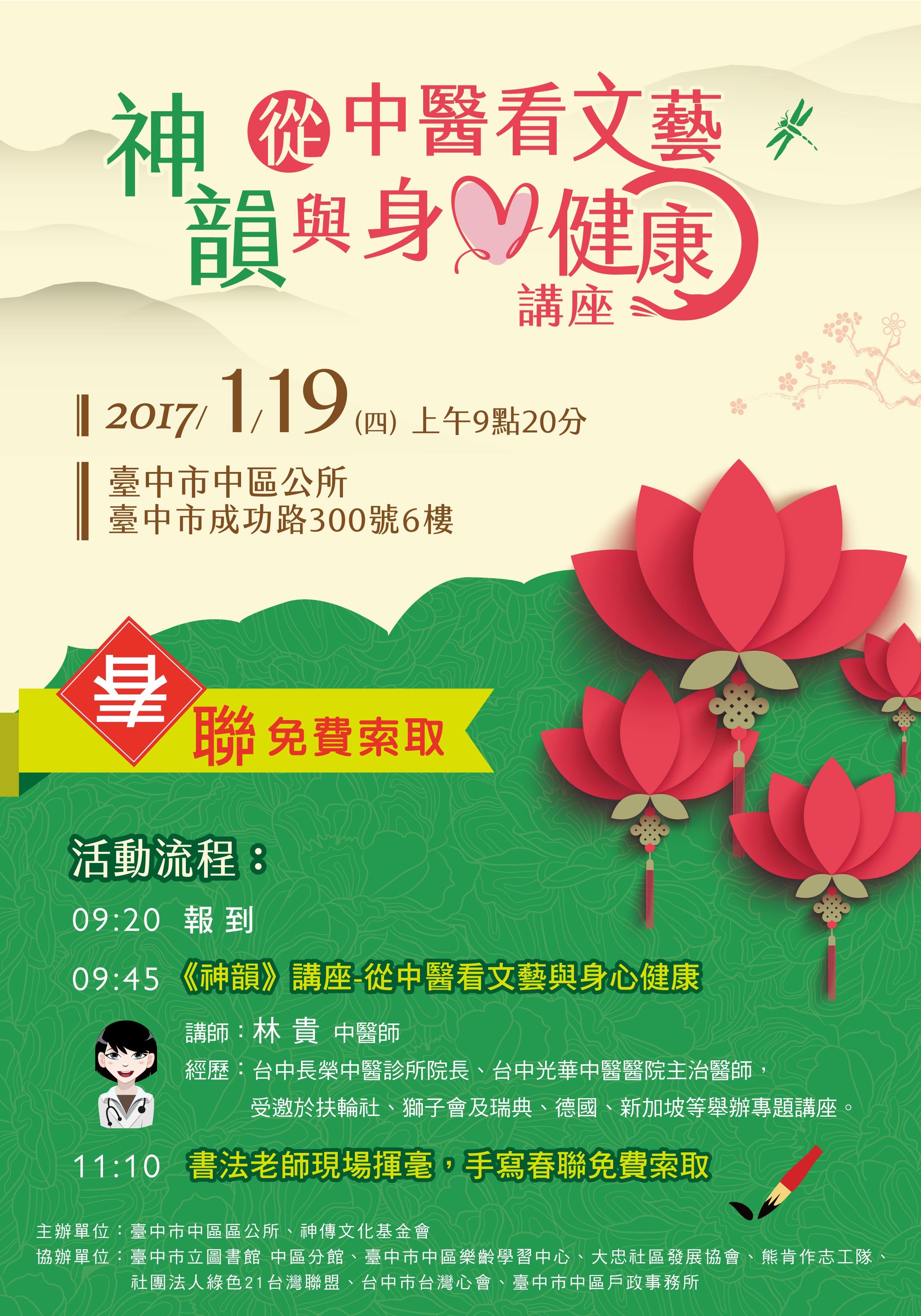 本所與財團法人神傳文化基金會訂於106年1月19日(四)上午9時20分於本所6樓禮堂,合辦「2017《神韻》藝文系列講座暨現場揮毫春聯贈送」活動,敬邀市民朋友共襄盛舉!