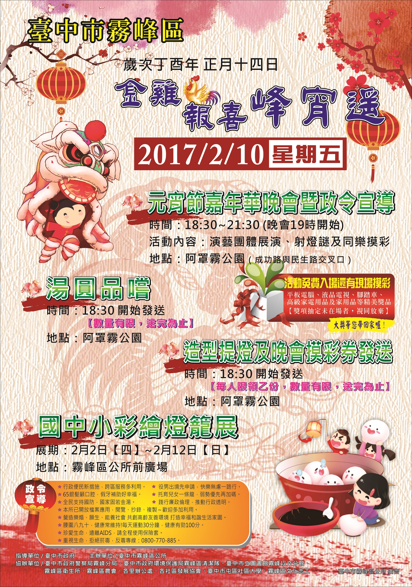本所訂於106年2月10日(星期五)晚上6時30分至9時30分於阿罩霧公園(成功路與民生路交叉路口)舉行「元宵節嘉年華晚會暨政令宣導活動」,節目安排戰鼓啟福、舞龍及舞獅,並邀請臺中圓滿樂團現場演出。另外還有射燈謎與摸彩活動,等您一起來同歡!活動當天晚上6時30分開始發送造型燈籠及晚會摸彩券,數量有限,送完為止喔!現場另有湯圓品嚐及各單位政令宣導互動攤位,臺中市政府地方稅務局更有「捐發票.換燈籠」活動(3張發票),歡迎民眾屆時踴躍參加。此外,國中小彩繪燈籠展將從106年2月2日至2月12日於公所前廣場展出,邀您一起來賞燈.慶元宵。 聯絡人:謝先生 聯絡電話:04-23397128分機517