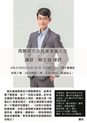 蔡志雄為現職律師、不動產經紀人、好房網、Yahoo奇摩房地產、女人變有錢、鉅亨網專欄作家,著有《我是612--我當包租公》等書籍。歡迎蒞臨聆賞!本活動辦理時間為106年3月19日(日)14:30-16:30;地點為屯區藝文中心3樓大會議室(臺中市太平區大興路201號),採排隊入場,座位198席,額滿為止。 聯絡人:葉芷秀 聯絡電話:04-23921122#112