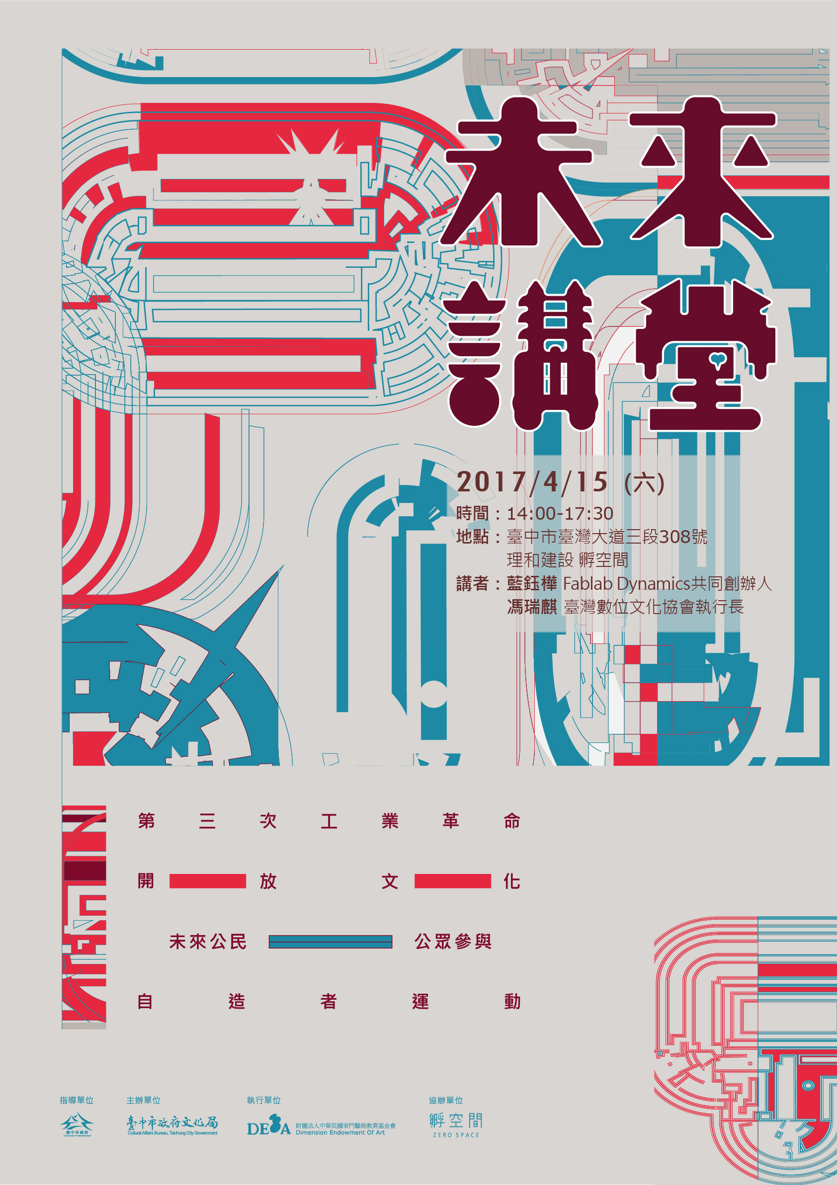 二、、為推廣本市數位文化願景,促進臺灣數位文化中心計畫之發展,特別規劃「未來講堂」系列講座,本次邀請到Fablab Dynamics共同創辦人藍鈺樺、臺灣數位文化協會執行長馮瑞麒,與大家分享他們在國際上參與數位文化、公民參與及合作共創的實際經驗,並邀請各領域的與談者,進行一場文化、科技與產業的跨領域精彩座談。