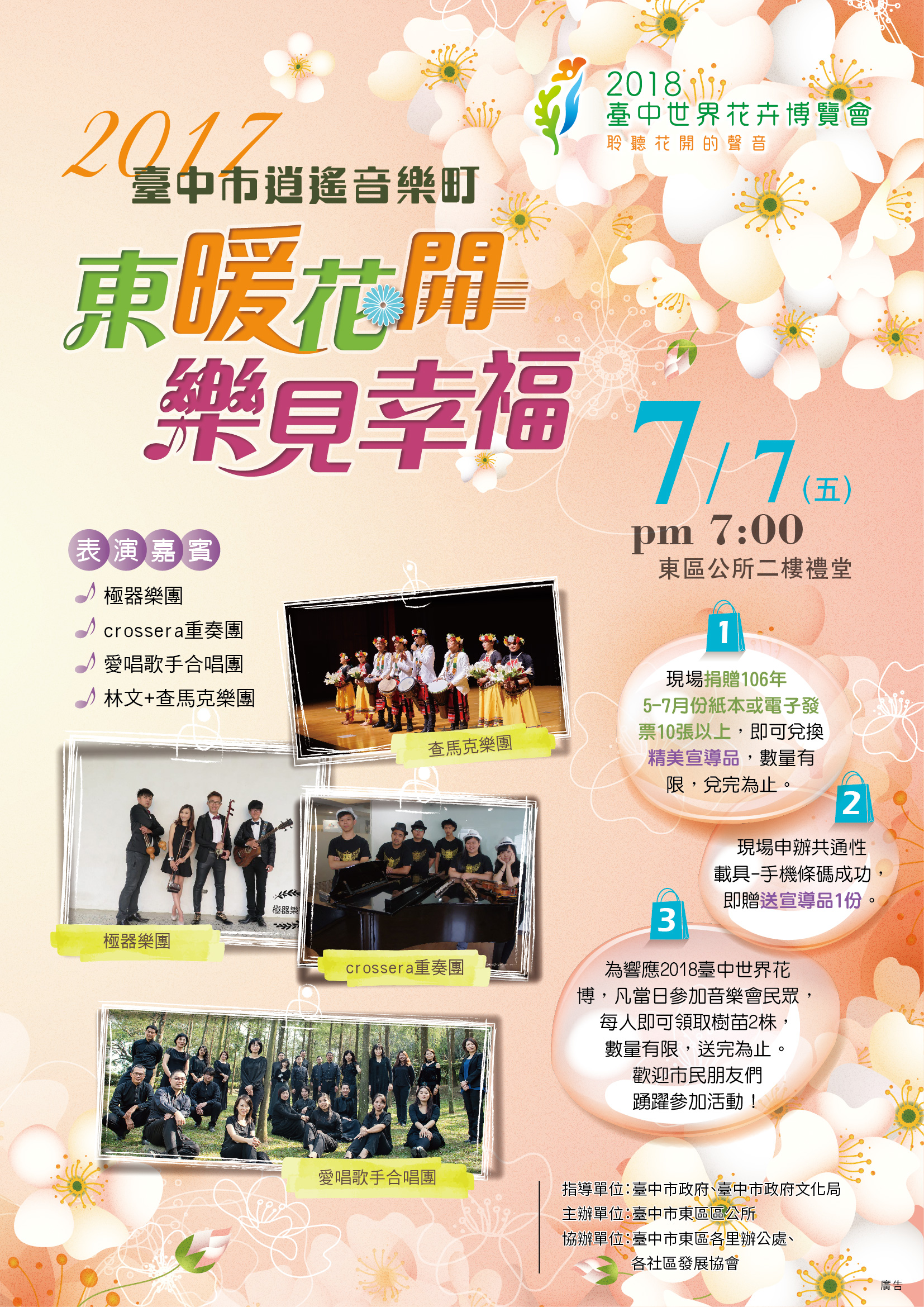 為迎接2018世界花博在臺中,本次音樂會主軸以花為意象,巧妙搭配與花有關的音樂曲目,讓前來聆聽的朋友們共同感受花的魅力與風情萬種!今年東區公所也特別與市府農業局合作,凡參加活動民眾即可領取樹苗,邀請市民共同打造綠色宜居的花園城市! 聯絡人:張沛誼 聯絡電話:22151988分機305