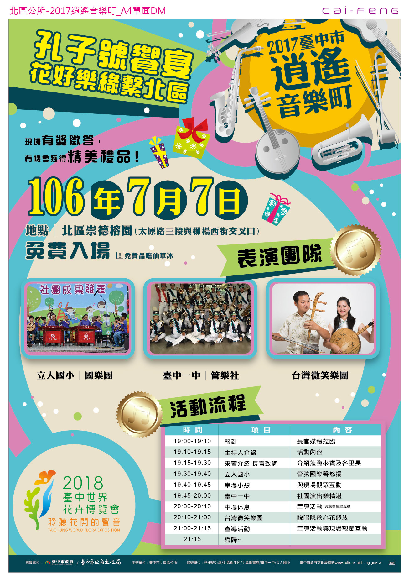106年7月7日(五)晚上19:00開始,於本區崇德榕園辦理2017臺中市逍遙音樂町活動,本次音樂會邀請在地立人國小國樂團、臺中一中管樂隊,及台灣微笑樂團精采演出,節目串場安排有獎徵答,現場還有地方稅務局、經濟發展局、北區圖書館及國軍人才招募中心等機關辦理政令宣導活動,贈送精美禮品,更有免費的紅茶及仙草冰可品嚐,歡迎踴躍蒞臨觀賞! 聯絡人:饒小姐 聯絡電話:04-22314031#124
