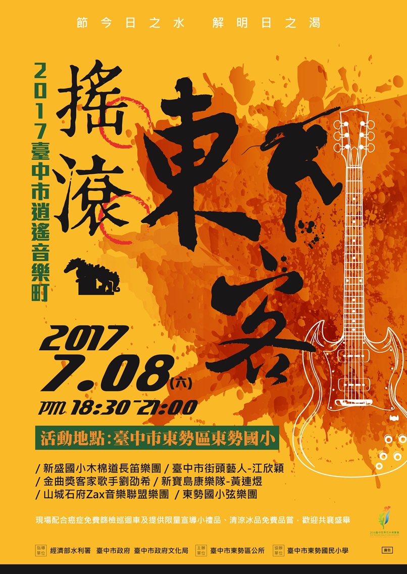 一、活動時間及地點:於本(106)年7月8日(星期六)晚上6時30分假本區東勢國小圖書館前廣場舉辦。 二、旨揭音樂會邀請在地東勢國小弦樂班、新盛國小木棉道長笛樂團、優美二胡表演-江欣穎小姐、金曲獎得獎歌手-劉劭希、新寶島康樂隊-黃連煜及山城石府Zax音樂聯盟樂團演出,現場配合癌症免費篩檢巡迴車及提供限量宣導小禮品、清涼冰品免費品嘗,歡迎共襄盛舉。 聯絡人:李小姐 聯絡電話:04-25872106 分機19