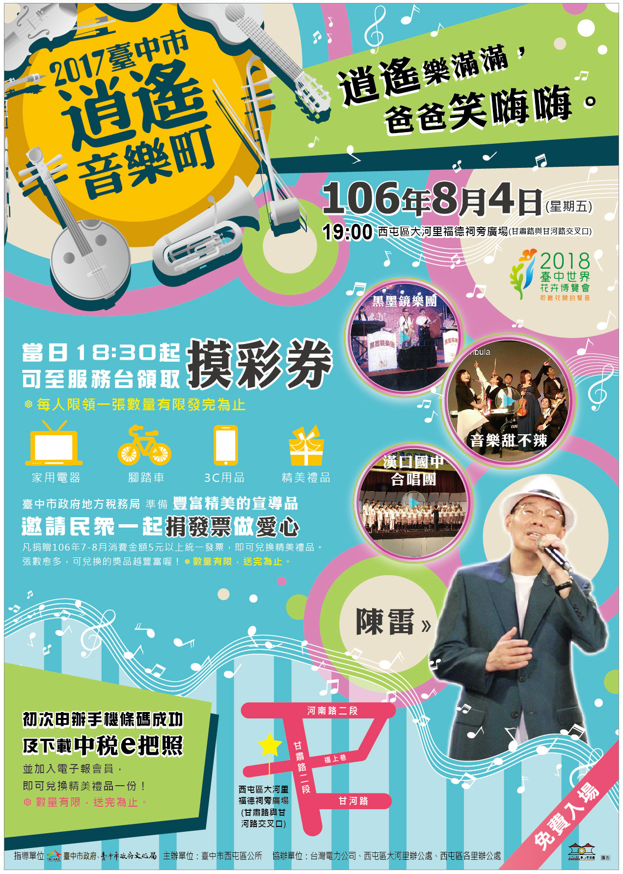 為了感謝天下所有爸爸的辛苦及宣導2018臺中花博,本所今年特別於父親節前辦理2017逍遙音樂町,表演團隊除了有在地學子漢口國中合唱團及音樂甜不辣樂團、黑墨鏡視障樂團等知名樂團,還邀請到全國知名藝人陳雷擔任壓軸,精彩可期。