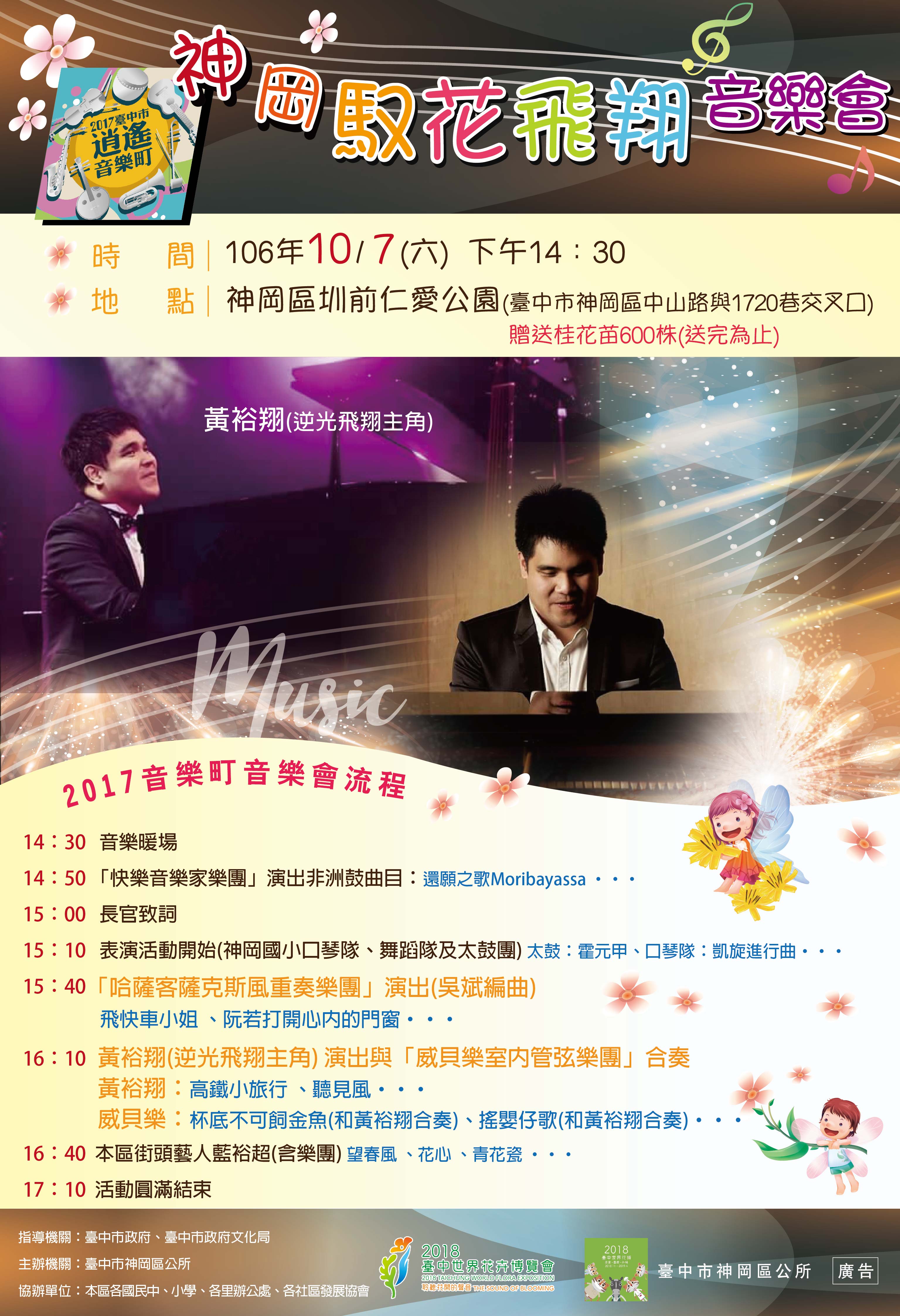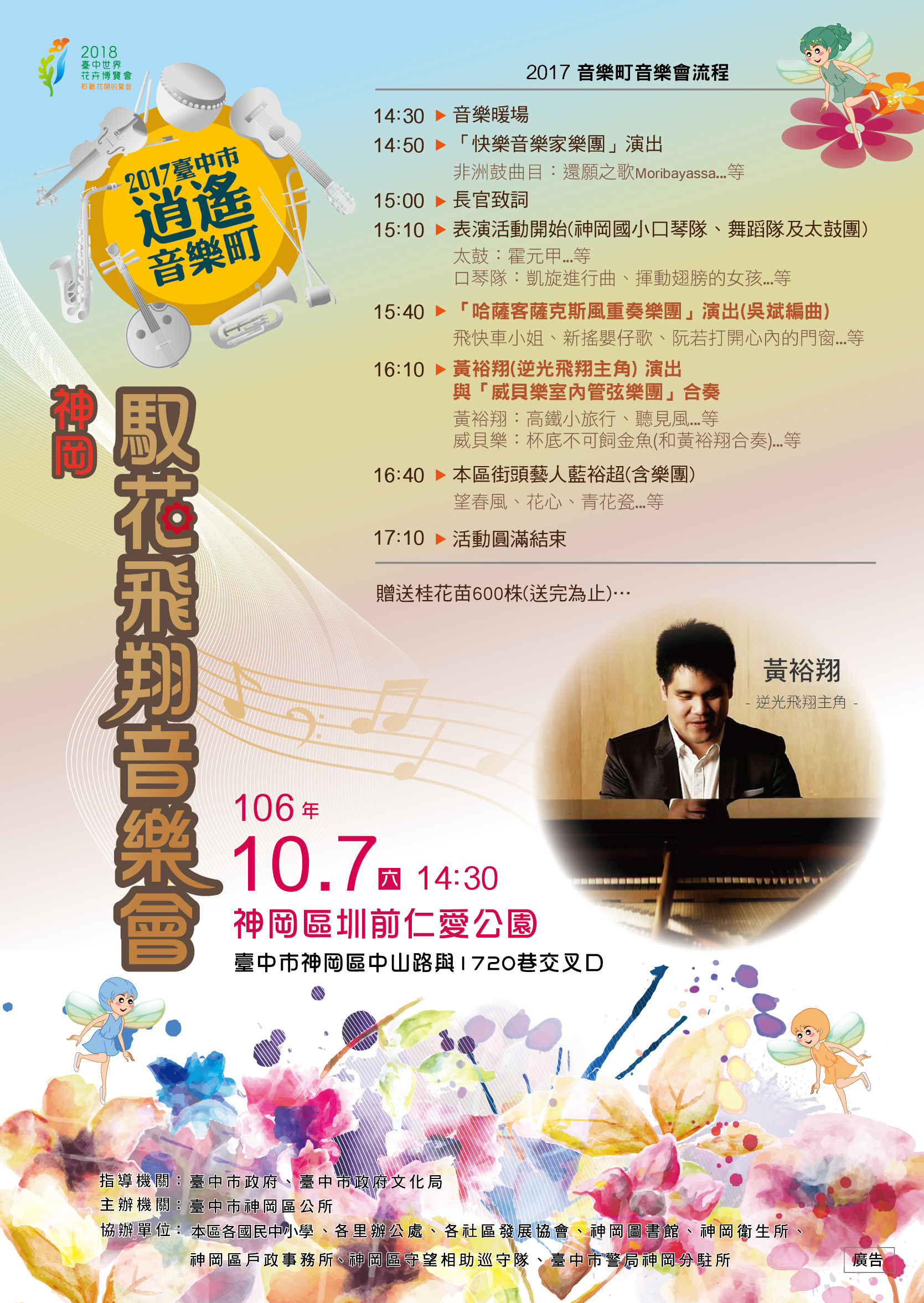 2017臺中市逍遙音樂町─馭花飛翔音樂會,本(106)年10月7日下午2時50分假神岡區圳前仁愛公園廣場舉辦,邀請第27屆金曲獎最佳作曲人獎,也是逆光飛翔主角的臺中人─「黃裕翔」到場演出,還有神岡國小口琴隊、太鼓隊、舞蹈社、「快樂音樂家樂團」、「鴻輝樂團」等優秀演藝團隊演出動人樂曲;此外,本區「哈薩客薩克斯風重奏樂團』將演出改編自呂泉生教授精采音樂『飛快車小姐』等樂曲,邀請您前來聆賞今秋最高水準的音樂盛宴!
